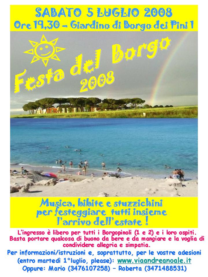 Con questa iniziativa, vogliamo ripetere la fortunata esperienza di un paio d’anni fa, che ci permise di organizzare una bellissima festa all’aperto, con grossa e sentita partecipazione da parte di tutti gli abitanti di Borgo dei Pini 1 e 2, e che fu, fra l’altro, foriera di amicizie e conoscenze ormai consolidate.